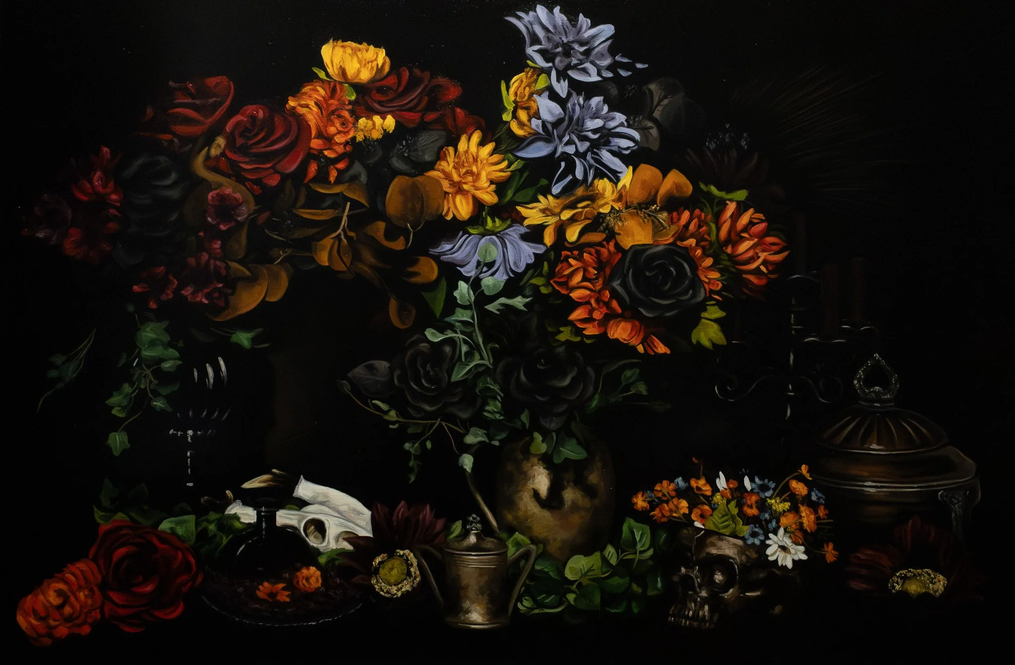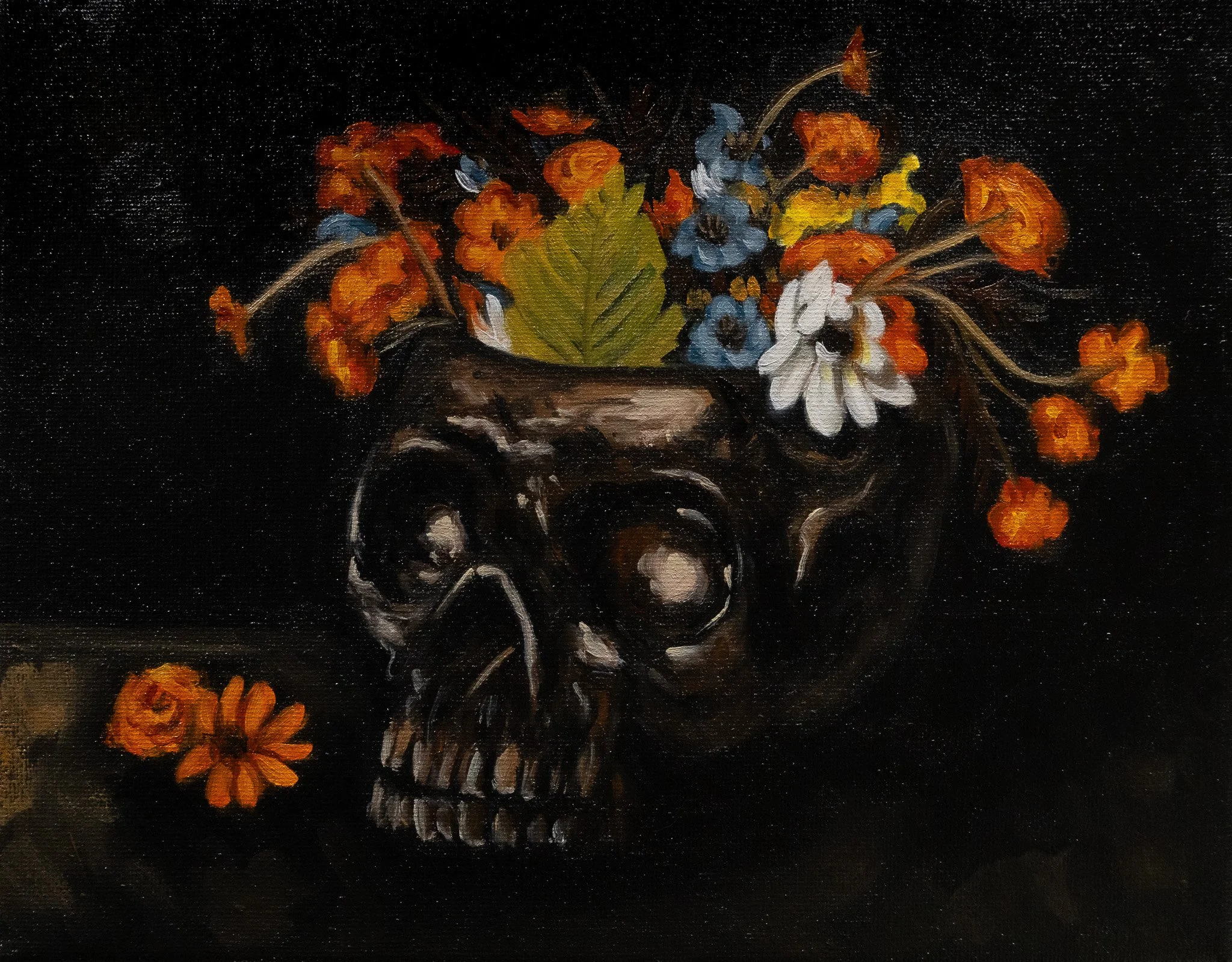 Skull with Flowers Detail, Oil on canvas, 8x10”, 2024